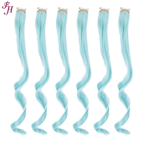 FH 6 pcs wavy wave clip in hair extensions color baby blue synthetic hair