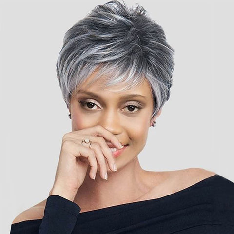 Lakihair Short Grey Wigs for Women Ombre Grey Pixie Cut Wig with Bangs Fluffy Hightlight Short Wigs