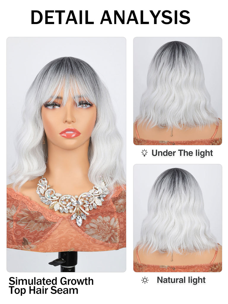 FH P14350 Rose Net Cosplay Bob Wig,Grey White Wavy Synthetic Hair Wig with Bangs