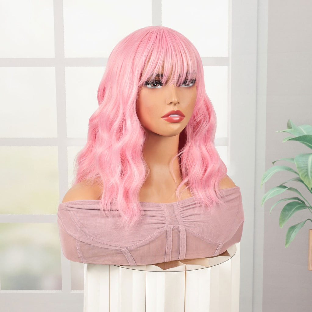 FH P13576 Rose Net Wavy Straight Pink Synthetic Bob Wig with Bangs