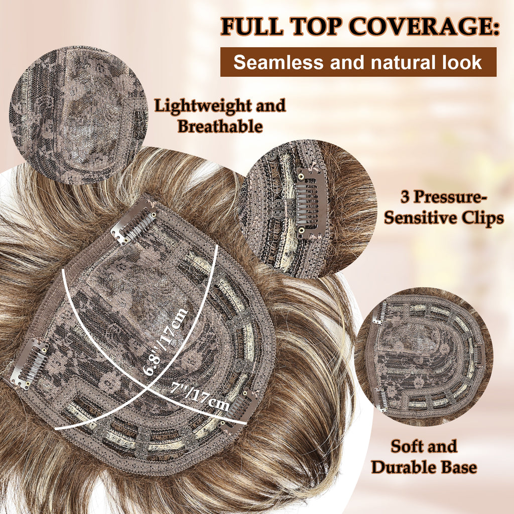 Easy Apply Secure Hold:This hair toppers is glueless,no wig cap,just open the 5 anti-slip clips and apply to your crown,clip on your own hair.5 clips make sure the hair topper stays in place,even during daily activities.Warm reminder:If the hair on the top of your head is too sparse,there will be nothing for the clip to hold and it cannot be secure.