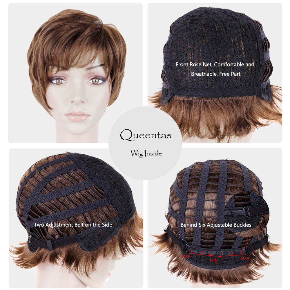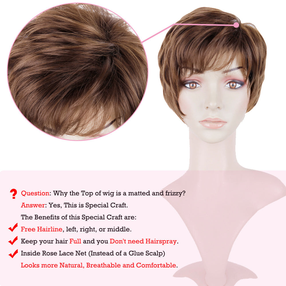 P12613 Short Brown Pixie Wigs with Bangs Layered Cut Natural Curl Straight Synthetic Hair Wig