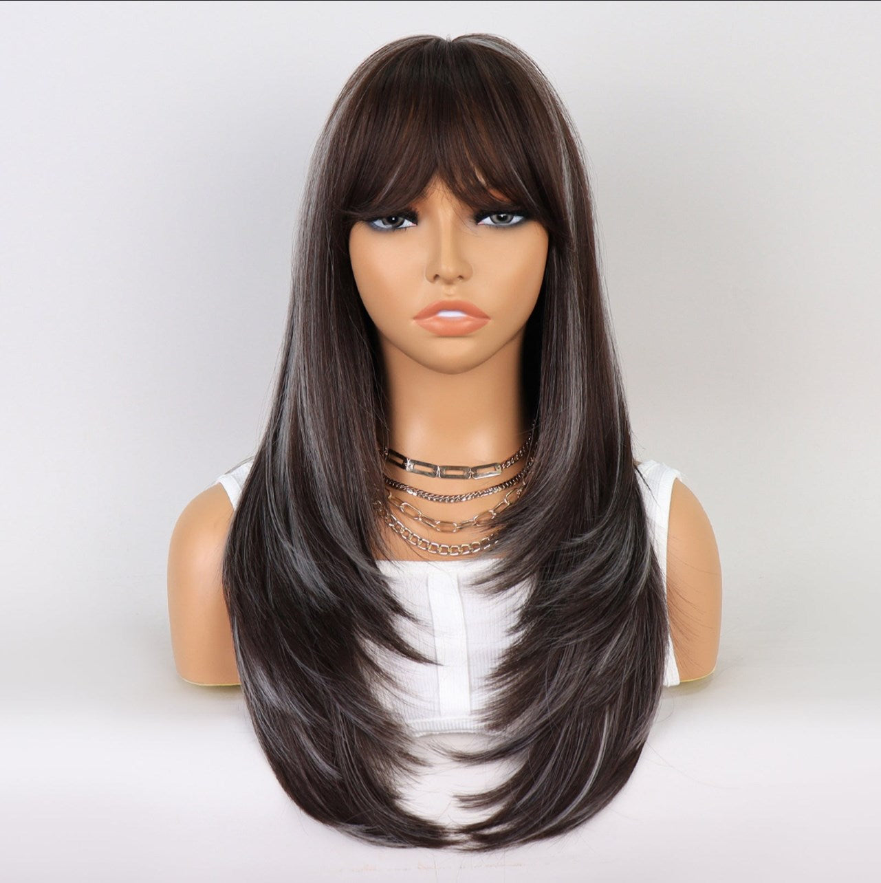 no40 ✨2PCS 50% OFF✨ FH P14240 Ombre Brown Gray Natural Wavy  Synthetic Wig with Bang