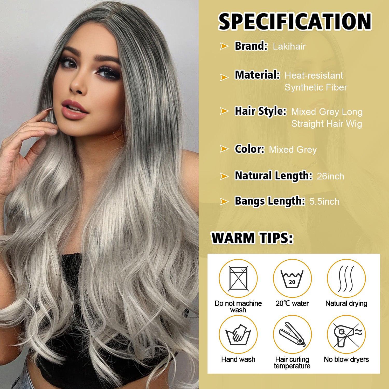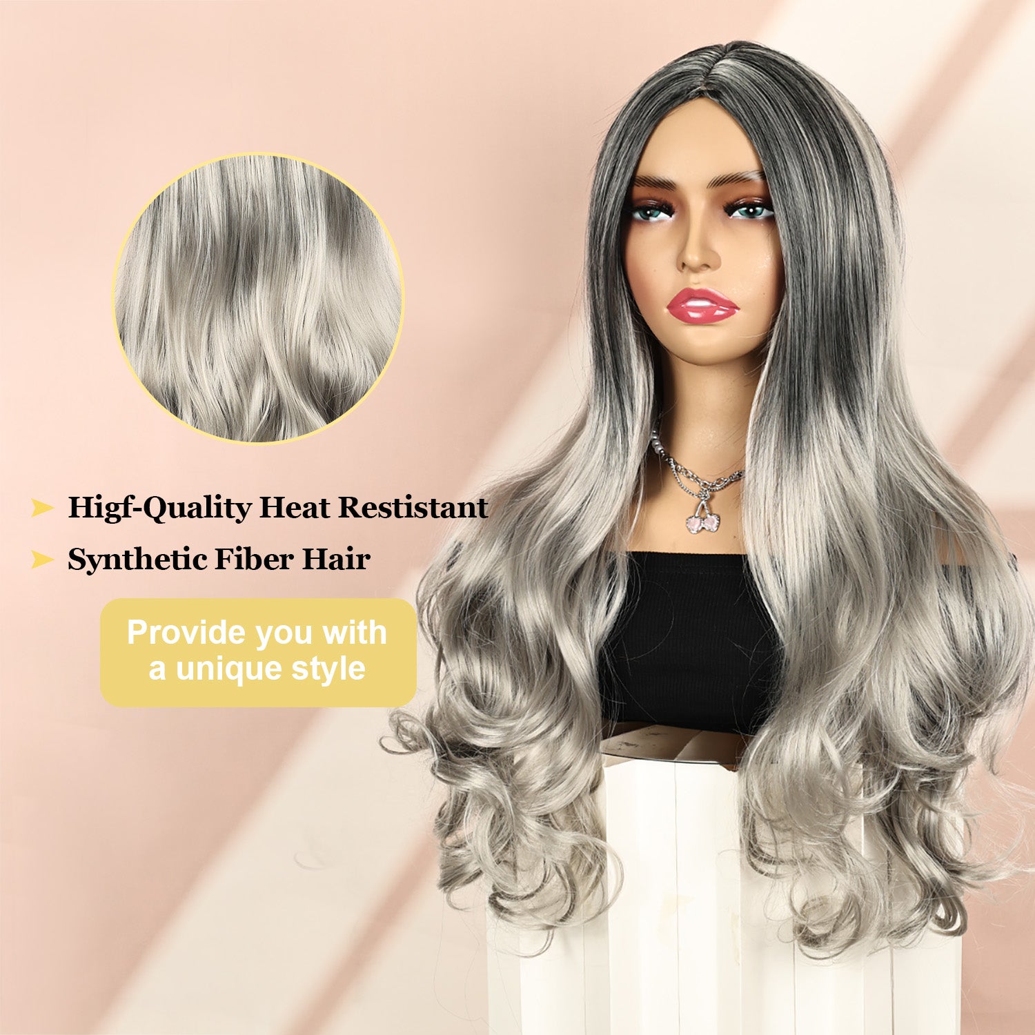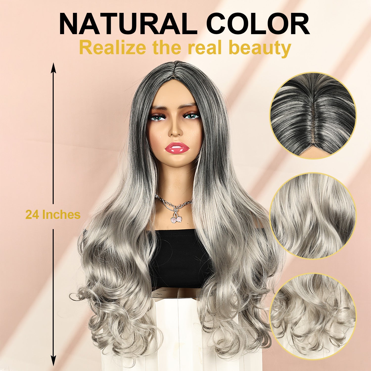 Lakihair 24inch Long Grey Wigs for Women Ombre Black Body Wave Wig