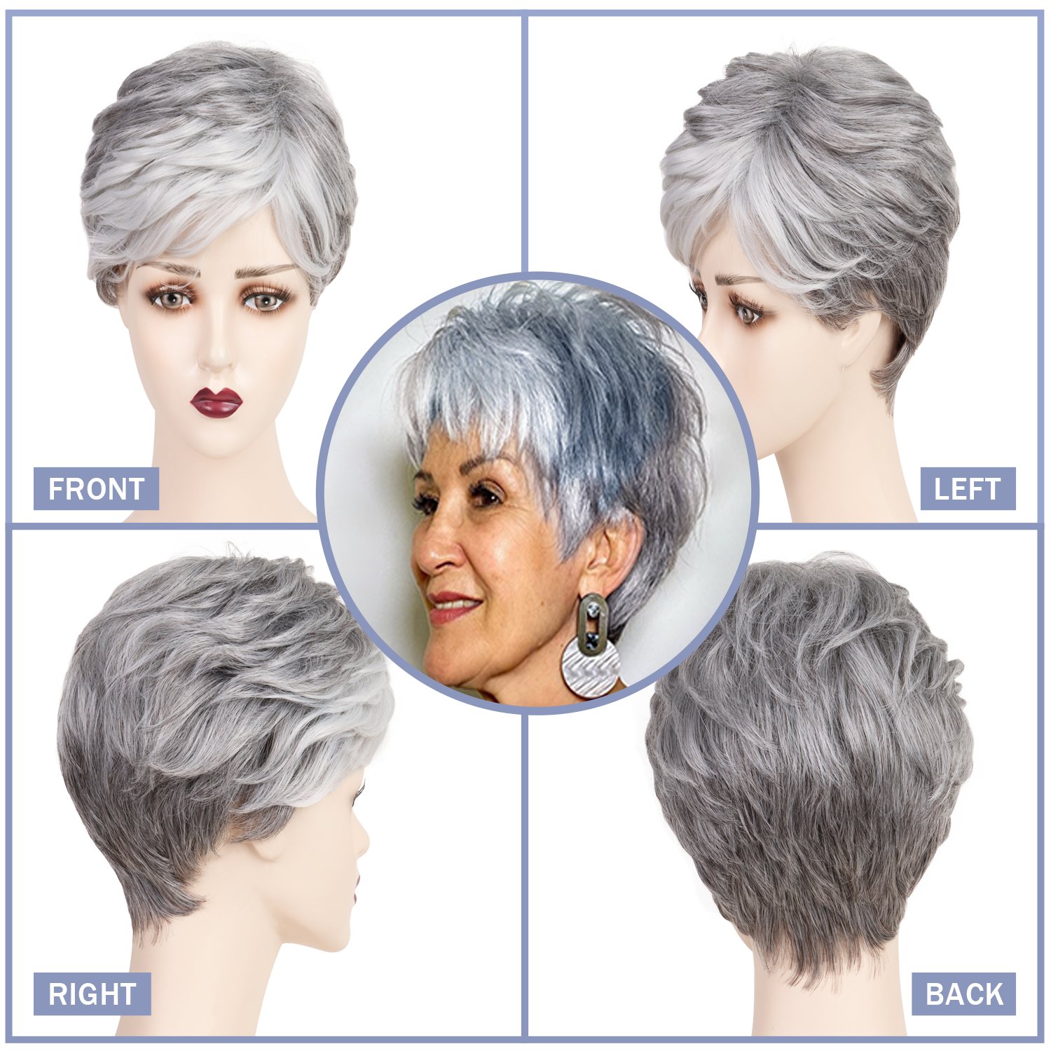 Lakihair Short Grey Wigs for Women Pixie Cut Wigs with Bangs Fluffy Layered Ombre Gray Wigs