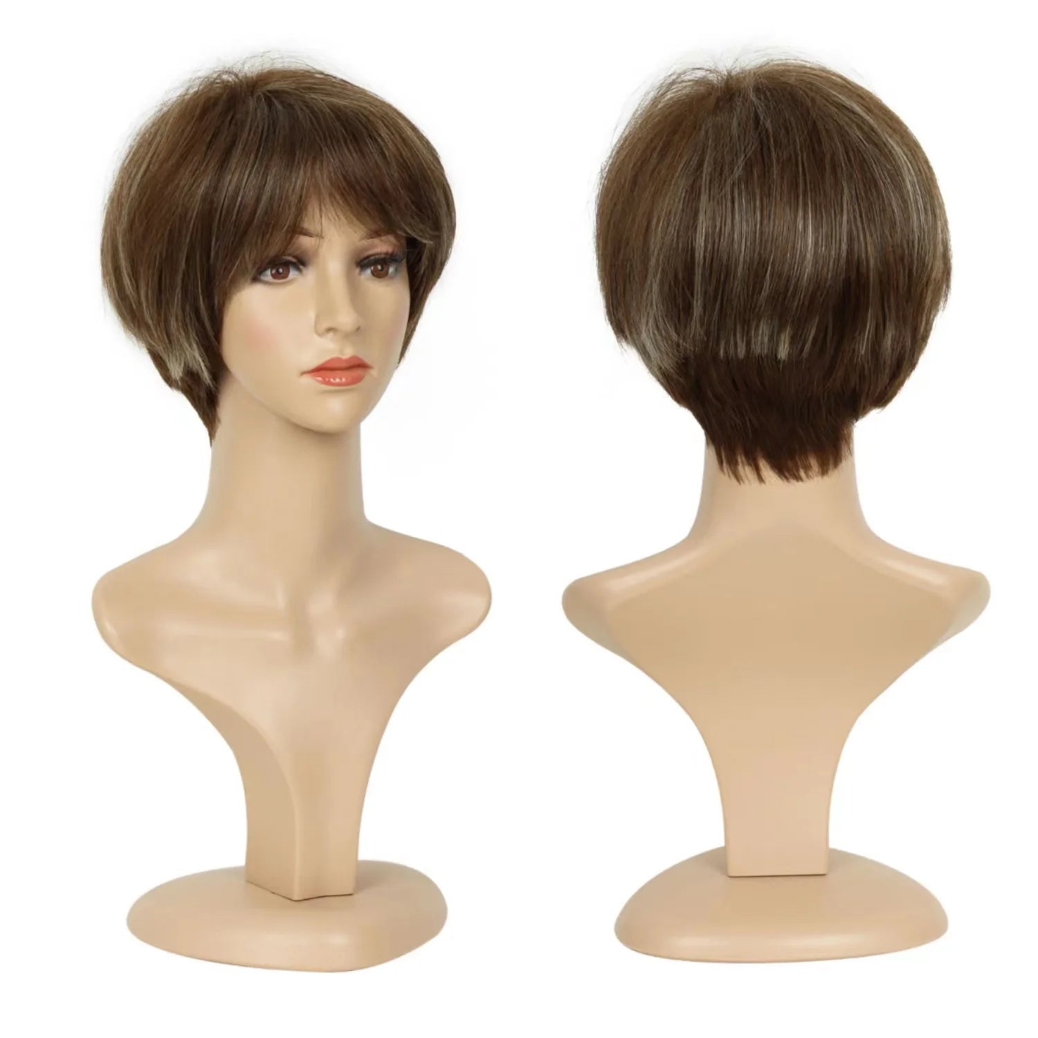- Wig Material/Texture: Creamily Dark Brown Mix Blonde Short Pixie Wigs with Bangs is made with high-quality heat-resistant synthetic fibers, up to 160 degrees Celsius (320 degrees Fahrenheit) . Realistic and natural,soft touch,Highly breathable.