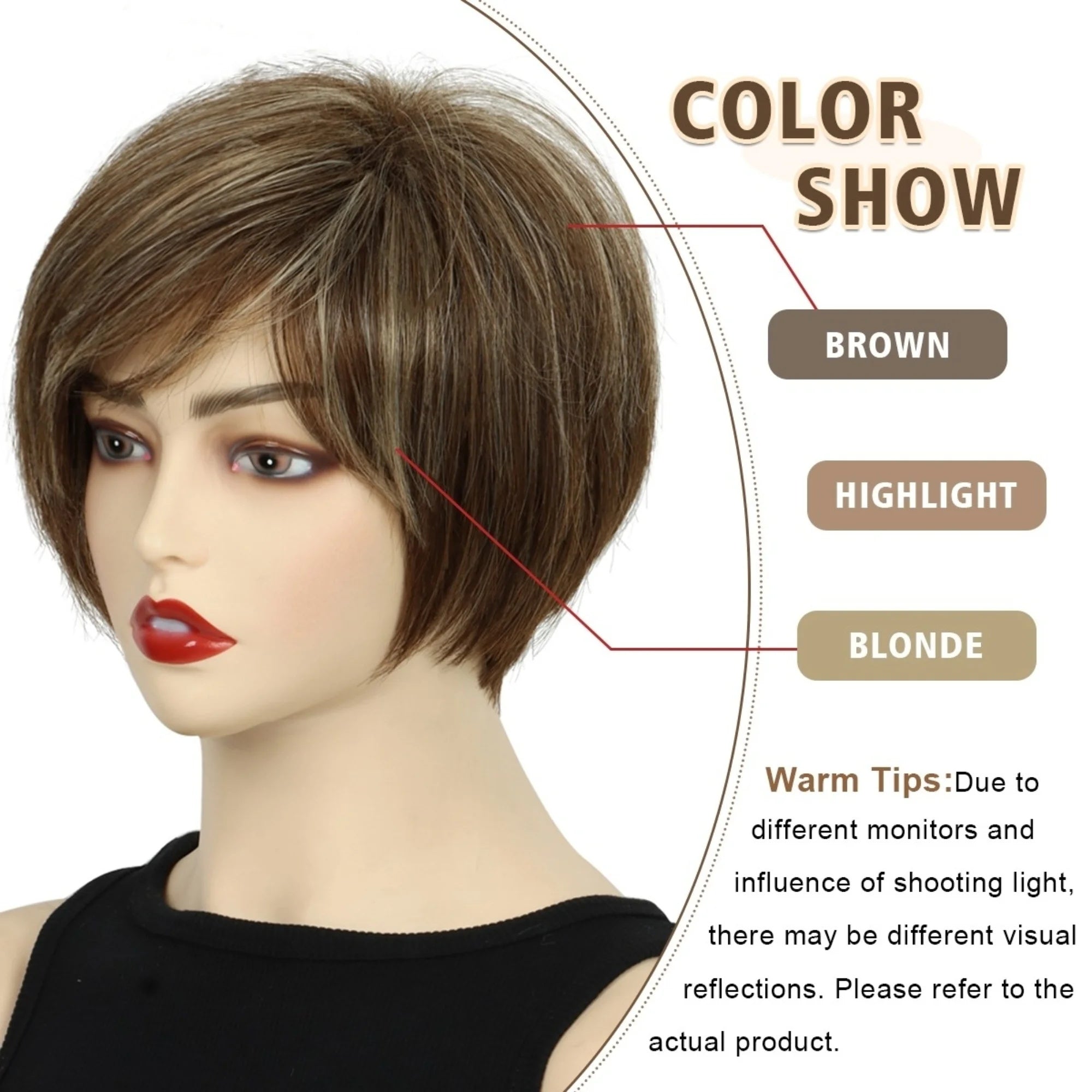Phocas Short Brown Wigs for Women Highlight Blonde Pixie Cut Wig with Bangs Wefted Wig Caps